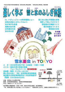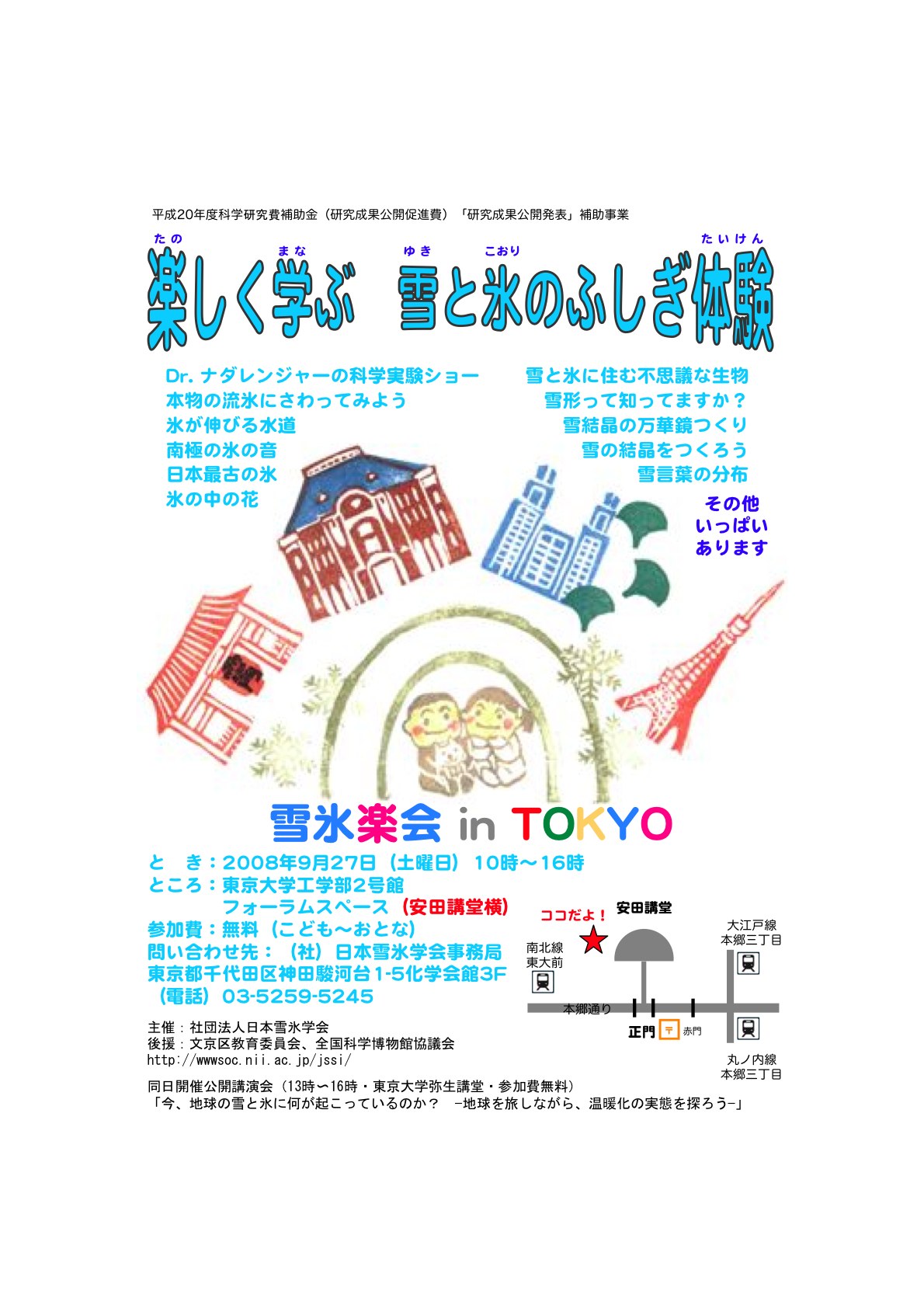 2008年度日本雪氷学会全国大会最終日に、平成20年度文部科学省科学研究費補助金(研究成果公開促進費)「研究成果公開発表(B)」による、主に青少年を対象にした一般向けの科学イベント「雪氷楽会 in 東京」を下記のとおり開催します。