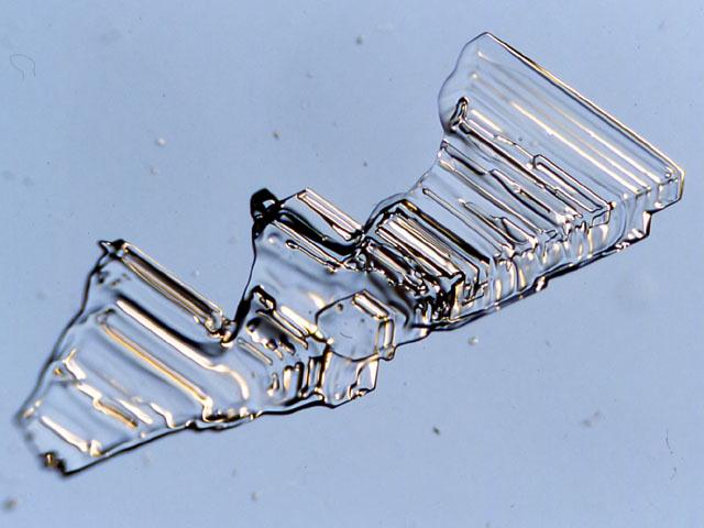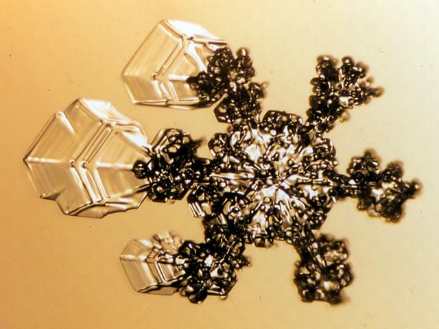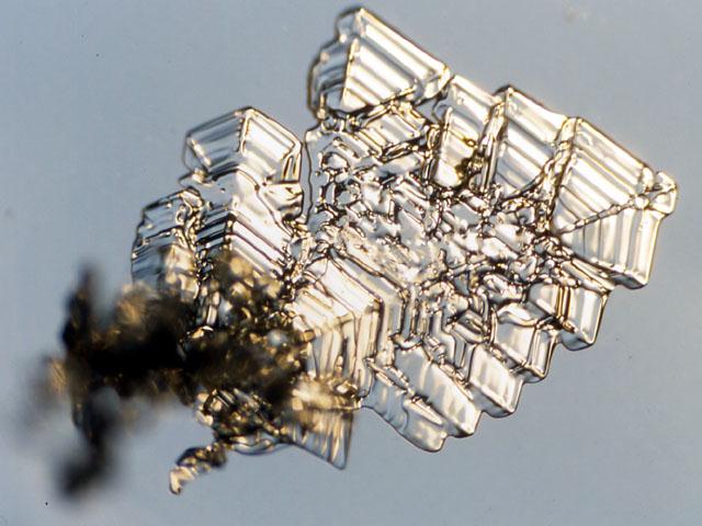 <雲粒のついた六花の新雪結晶から成長した表面霜>![]() 表面霜の結晶軸の方向が、母体である新雪結晶のそれと同じである様子がわかる。(表面霜の部分で1-2mm) (写真提供:八久保晶弘会員) |