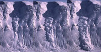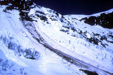 ノルウェーのリグフォーンで人工爆破により発生した煙型雪崩(1993年3月27日)。雪崩の厚さは50m、