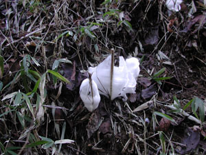 シモバシラ(Keiskea japonica Miq.)は関東以西の本州、四国、九州の山地の木陰に生えるシソ科の多年草である。冬のはじめ、地温はプラスだが地表面付近の気温がマイナスであるような条件で、根が吸い上げた水分が地上部で凍結し、茎に写真のような霜柱を形成する。(高尾山、東京都) (写真提供:森 淳子会員) |