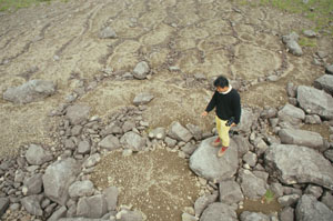 凍結融解現象により、ふるい分けられた粗い石と土とが、地表にパターンを作ったのが淘汰構造土である。良く知られている亀甲状のパターンは多角形土と呼ばれる。傾斜地では斜面方向に伸びた条線土となる。日本では一般に高山で観察できる。(大雪山) (写真提供:曽根敏雄会員) |