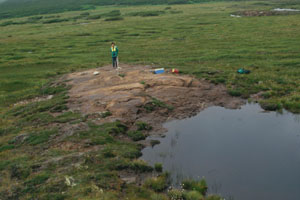 泥炭質の永久凍土丘であるパルサは、永久凍土の存在を示す指標地形である。局所的な永久凍土の発達に伴ってパルサは成長する。手前は永久凍土の衰退後に生じたサーモカルストによる池である。日本では大雪山でのみ存在が知られている。(大雪山) (写真提供:曽根敏雄会員) |