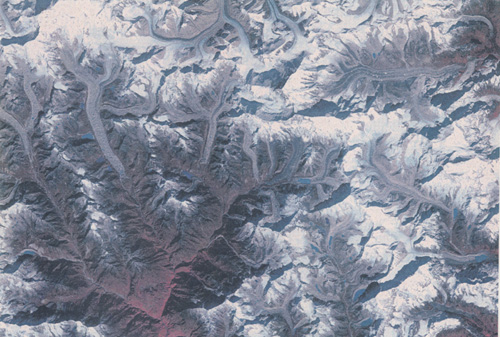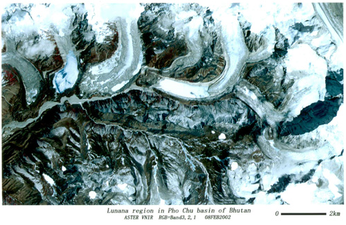 ブータンヒマラヤ:ルナナ地方の氷河と氷河湖(ASTER人工衛星画像.2002年2月) (写真提供:山田知充会員) |