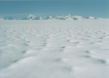 激しい融解によってパタゴニア北氷陸一面に形成された雪えくぼ(1985年12月) (写真提供:山田知充会員) |