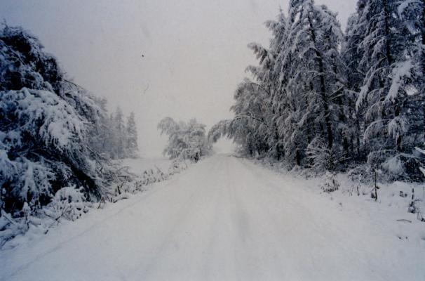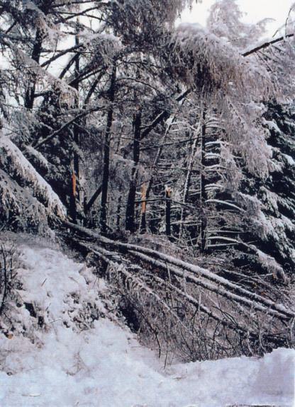 湿性の雪が降り続き樹木に着雪したため、雪の重さに耐えきれず幹の途中から折れた樹木 (写真提供:池田元基会員) |