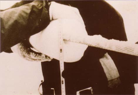 着雪の最大外径は約18cmに達した。着雪の比重は約0.7であった。 (写真提供:北海道電力(株)総合研究所電力グループ) |