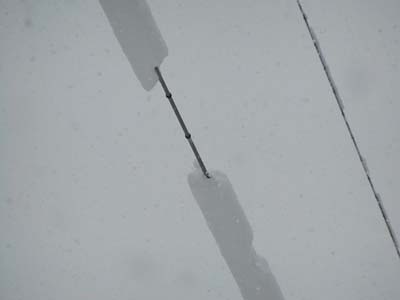 | 近年発生した電線着雪の写真である。着雪による被害を防止するために電線着雪対策の研究が