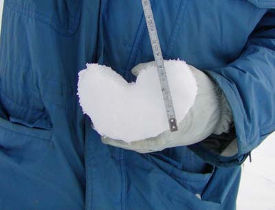 地上に落下した電線着雪の断面写真である。(上部中央のくぼみが電線の位置)
