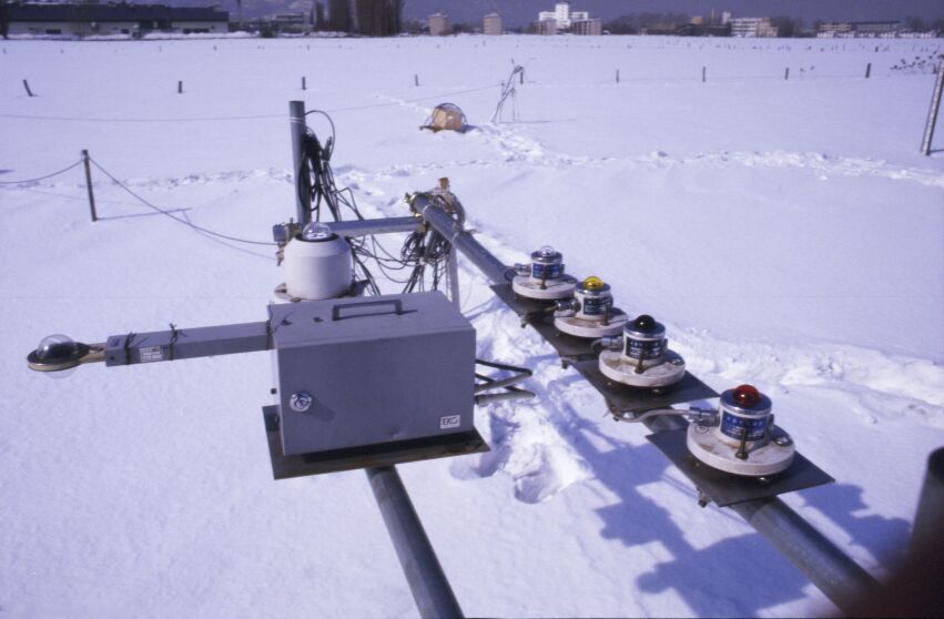 <雪面上での放射観測>![]() 右側:波長別放射計、 左側:放射収支計と全天日射計 (札幌・低温研北側裏の露場にて) (写真提供:石川信敬会員) |