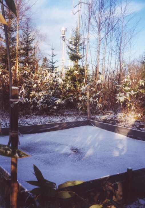 <積雪底面から流出する融雪水を計測する大型積雪ライシメータ(3.6m×3.6m)>![]() 写真は積雪前の状況で、この上に自然積雪を堆積させる。 (写真提供:山崎 学会員) |