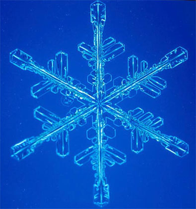 | 大雪山ではしばしばきれいな六花の雪結晶を見ることができます。雪は上空の気 温と水分量を反映して様々な形へと成長します。(1)は角板、(2)は広幅六花、(3)は樹枝状六花と呼ばれる結晶です。中には(4)のように樹枝状六花を2つ組み合わせた十二花が見られることもあります。(写真提供:尾関俊浩会員) | |