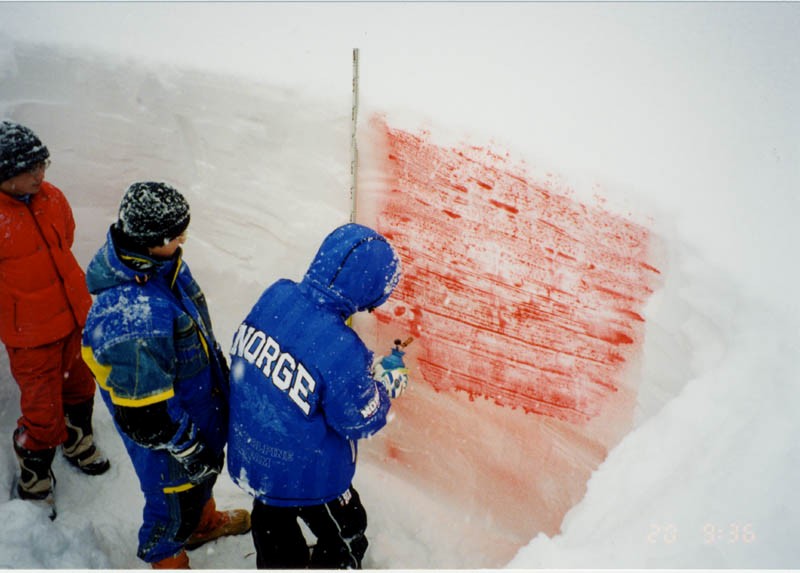 積雪を観察するにはスノーピットと呼ばれるたて穴を掘ります。壁面をき